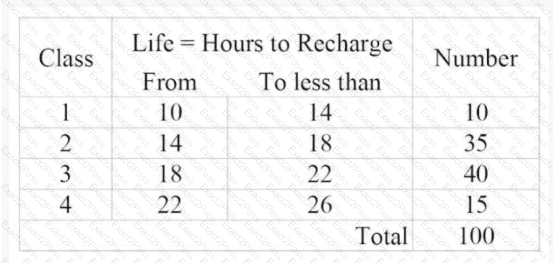 A frequency distribution of measurements for the useful life of rechargeable industrial batteries is shown below.