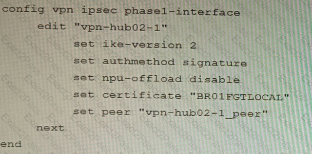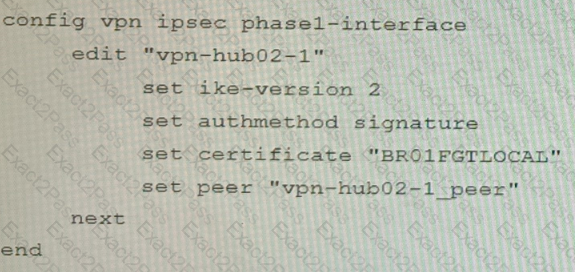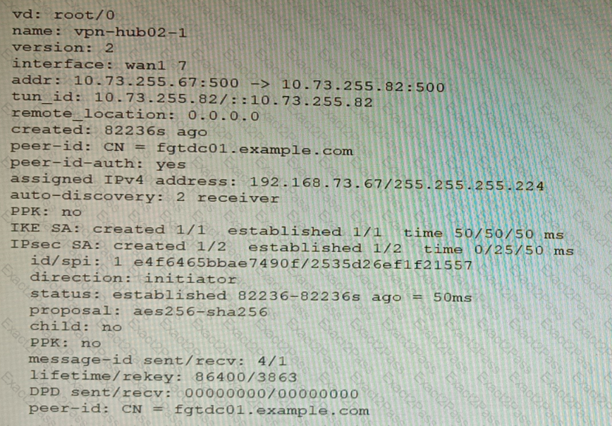 A Hub FortiGate is connecting multiple branch FortiGate devices separating the traffic centrally in unique VRFs. Routing information is exchanged using BGP between the Hub and the Branch FortiGate devices.