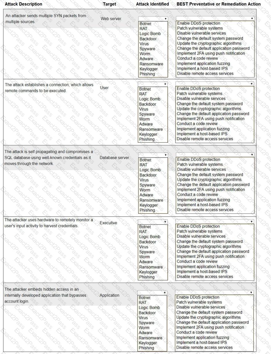 Select the appropriate attack and remediation from each drop-down list to label the corresponding attack with its remediation.