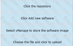 Drag and drop the steps from the left into the order on the right to upload software on vManage repository that is accessible from maintenance > Software Repository.