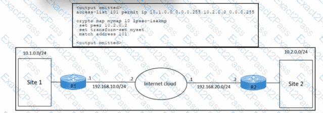 Refer to the exhibit. An engineer must configure an IPsec VPN connection between site 1 and site 2. The indicated configuration was applied to router R1; however, the tunnel fails to come up. Which command must be run on R1 to resolve the issue?