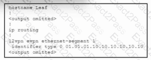 Refer to the exhibit. An engineer must configure dual-homing with single active redundancy in a BGP EVPN VXLAN fabric. Which command must be run on the leaf router to complete the EVPN Ethernet segment configuration?