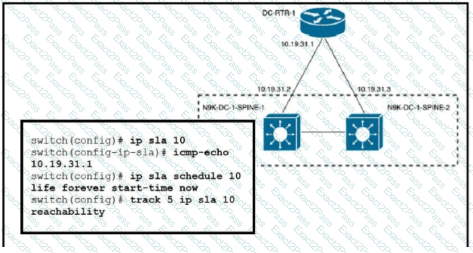 Refer to the exhibit. An engineer must invoke a Python script that alerts the operations team when the router DC-RTR-1 becomes unreachable. Which configuration set accomplishes this task?