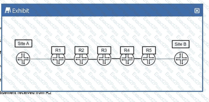 The second criterion is thelabel number advertisement received from R2(Option D). MPLS relies on downstream label allocation. In this topology, R2 is the immediate downstream "next hop" for R1 on the path to Site B. For the LSP to be established, R2 must signal a label to R1 using a protocol like LDP (Label Distribution Protocol) or RSVP (Resource Reservation Protocol). This label (in this case, 7166) tells R1: "If you want to send traffic to the destination associated with this LSP, wrap it in this specific label so I know how to process it."