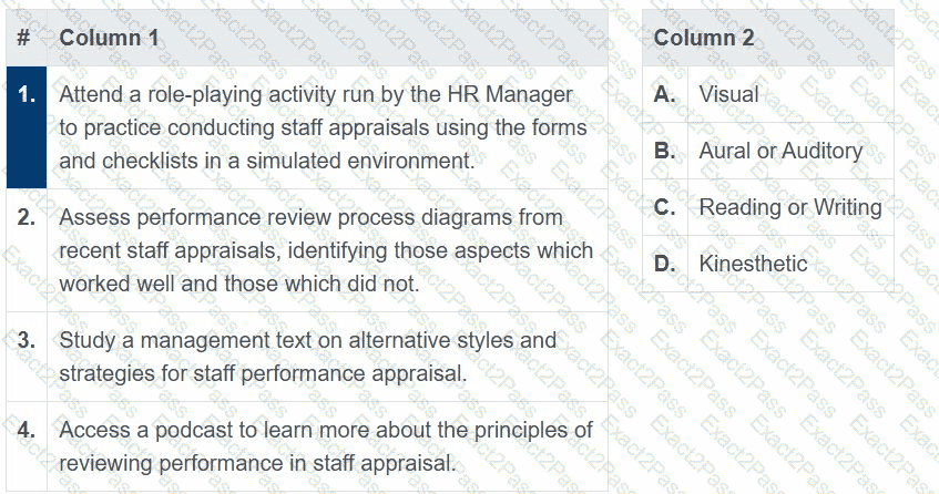 For each learning activity in Column 1, select from Column 2 the VARK