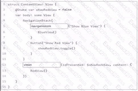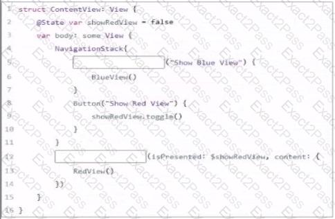 Complete the code that will add the BlueView to the NavigationStack and present the RedView modally.