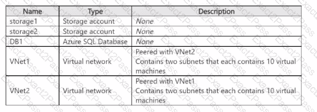 You need to ensure that the virtual machines can access storage1, storage2, and DB1 by using service endpoints.