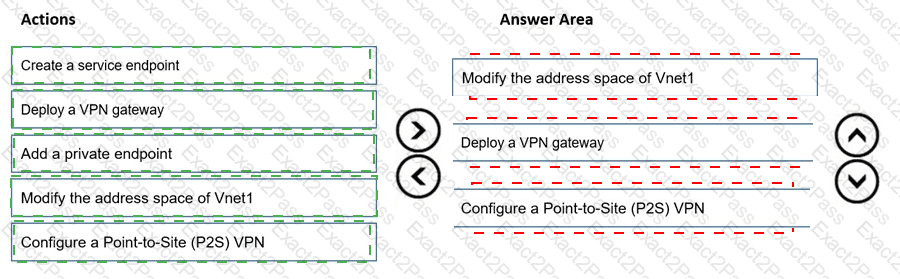 Which three actions should you perform in sequence before you can integrate WebApp1 and Vnet1? To answer, move the appropriate actions from the list of actions to the answer area and arrange them in the correct order.