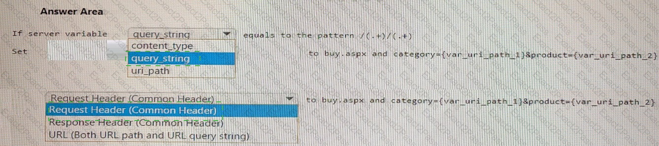 You need to create a rewrite rule for AppGw1. The solution must rewrite the URL of requests from https://www.contoso.com/fashion/shirts to ttps://www.contoso.com/buy.aspx?category-fashion &product=shirts.