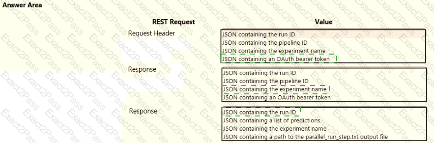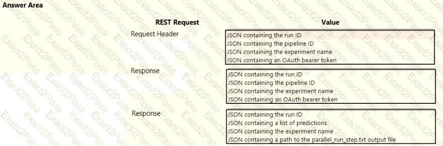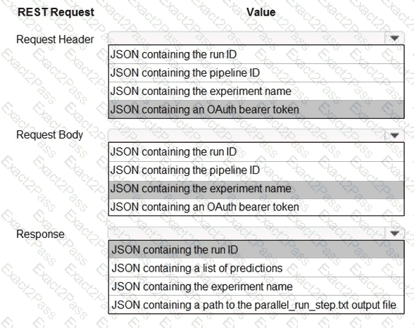 Which values should you use in the REST request and to expect in the response? To answer, select the appropriate options in the answer area.