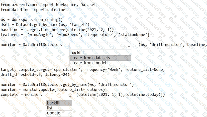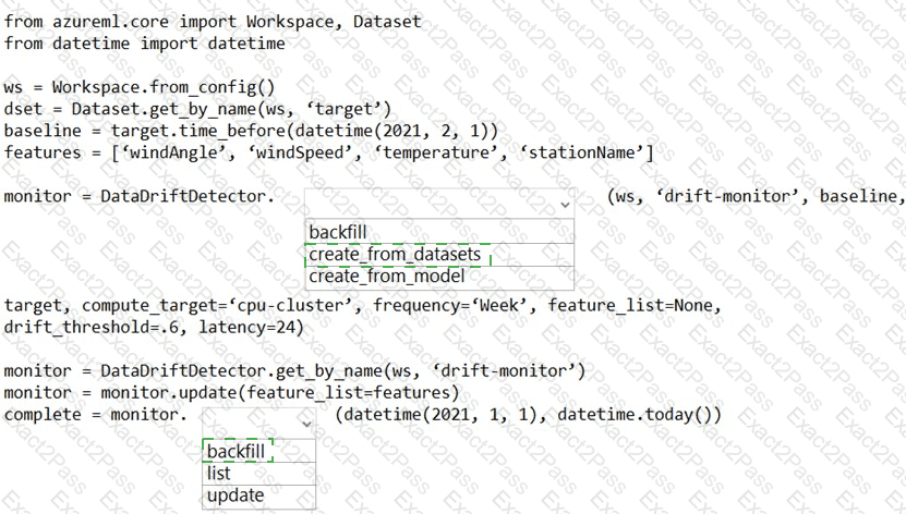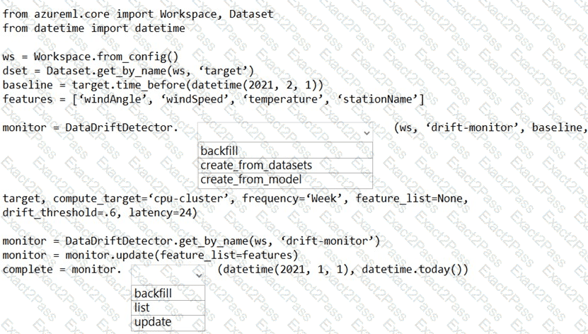How should you complete the code segment? To answer, select the appropriate options in the answer area.