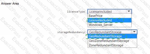 You need to specify the licenseType and storagenedundancy parameters. The deployment must meet the availability requirements and the business requirements for DB1 and DB2.