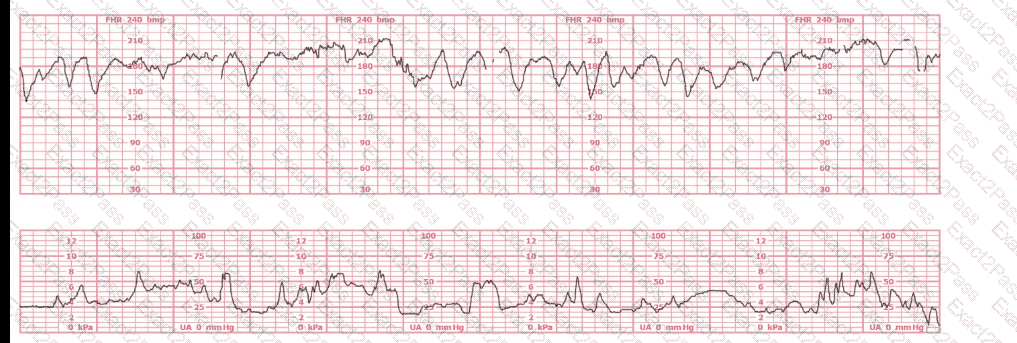 The tracing shown is from a woman at 28-weeks gestation in the post-anesthesia care unit (PACU) after an appendectomy. She is alert and awake. Based on this fetal heart rate pattern, the most appropriate intervention is: