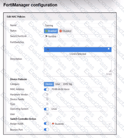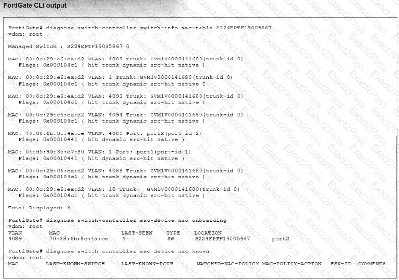 The NAC feature is being tested with a device connected to port2 on managed FortiSwitch S224SPTF19005867. The NAC policy has been applied to port2, and traffic was generated from the test device. However, the traffic from the test device does not match the NAC policy and remains in the onboarding VLAN.