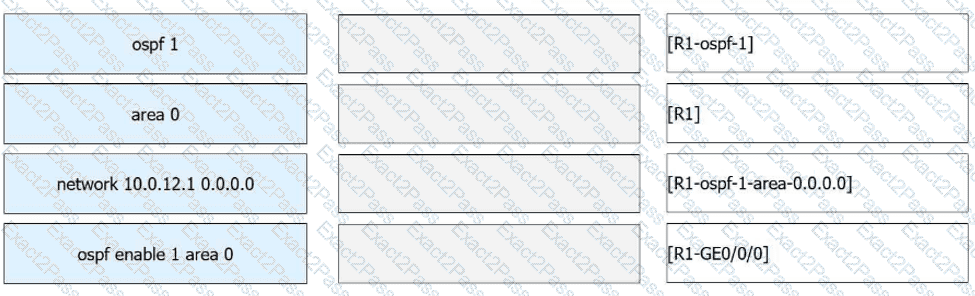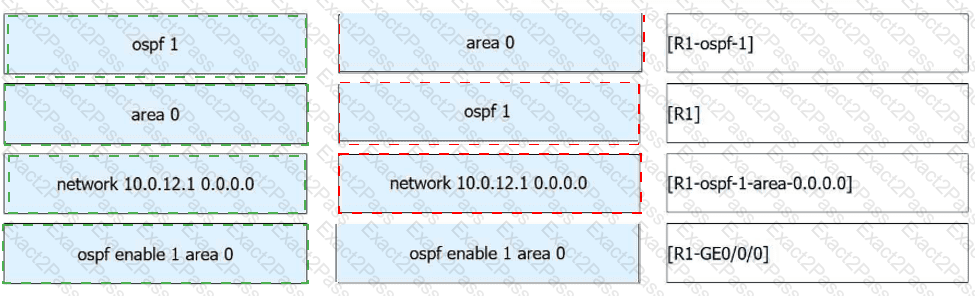 Assume that the IP address of GE0/0/0 on R1 is 10.0.12.1/24. Multiple commands can be used to enable OSPF on this interface. Match the commands with their configuration views.