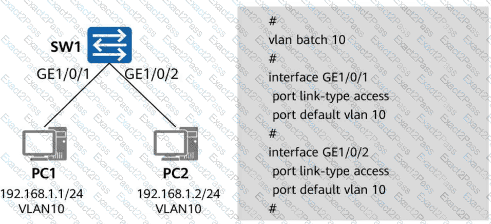 In the figure, both PC1 and PC2 belong to VLAN 10. Interface GE1/0/1 on SW1 is a trunk interface with the default PVID, and interface GE1/0/2 on SW1 is an access interface in VLAN 10. Which of the following statements are true about the forwarding of data frames between PC1 and PC2? (Select all that apply)