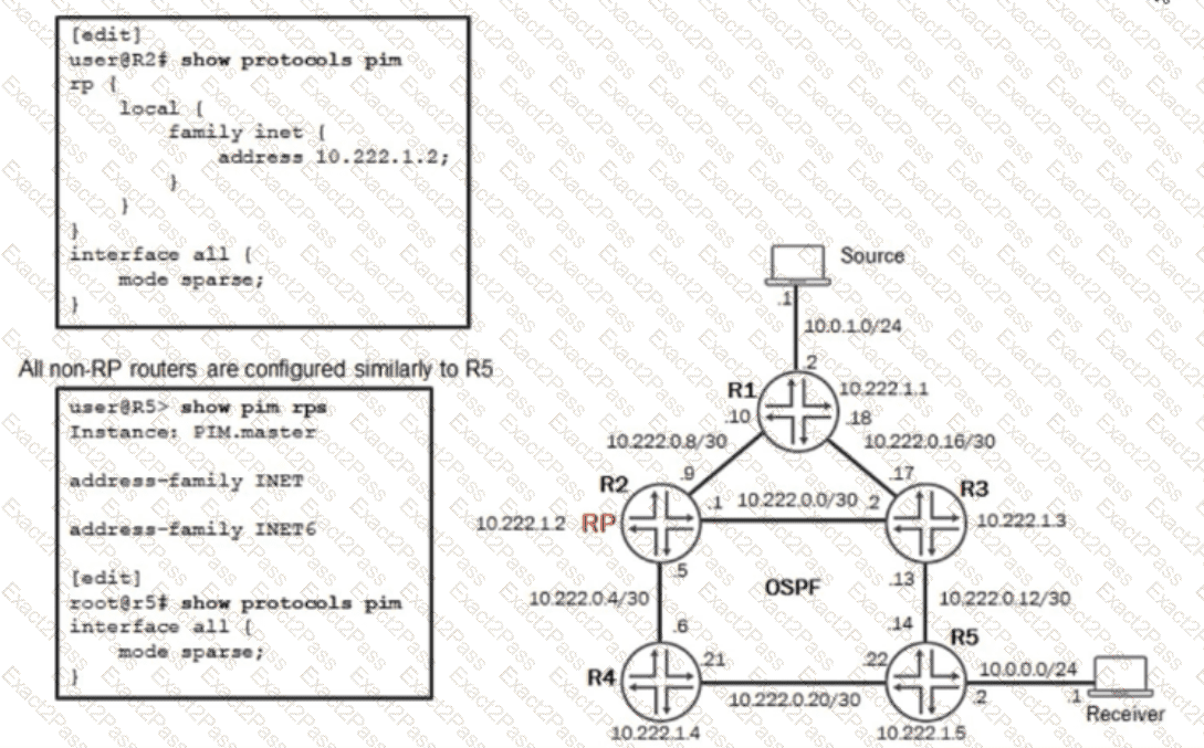 Referring to the exhibit. R2 receives a packet from the multicast source on its ge-0/0/4 0 interface.