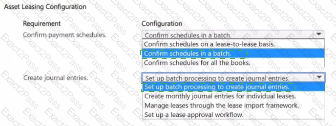 How should you configure asset leasing? To answer, select the appropriate options in the answer area.