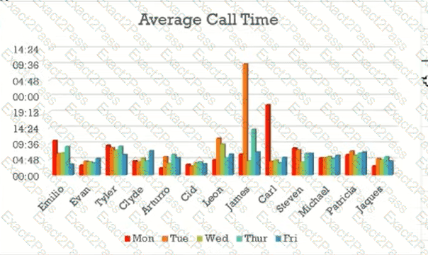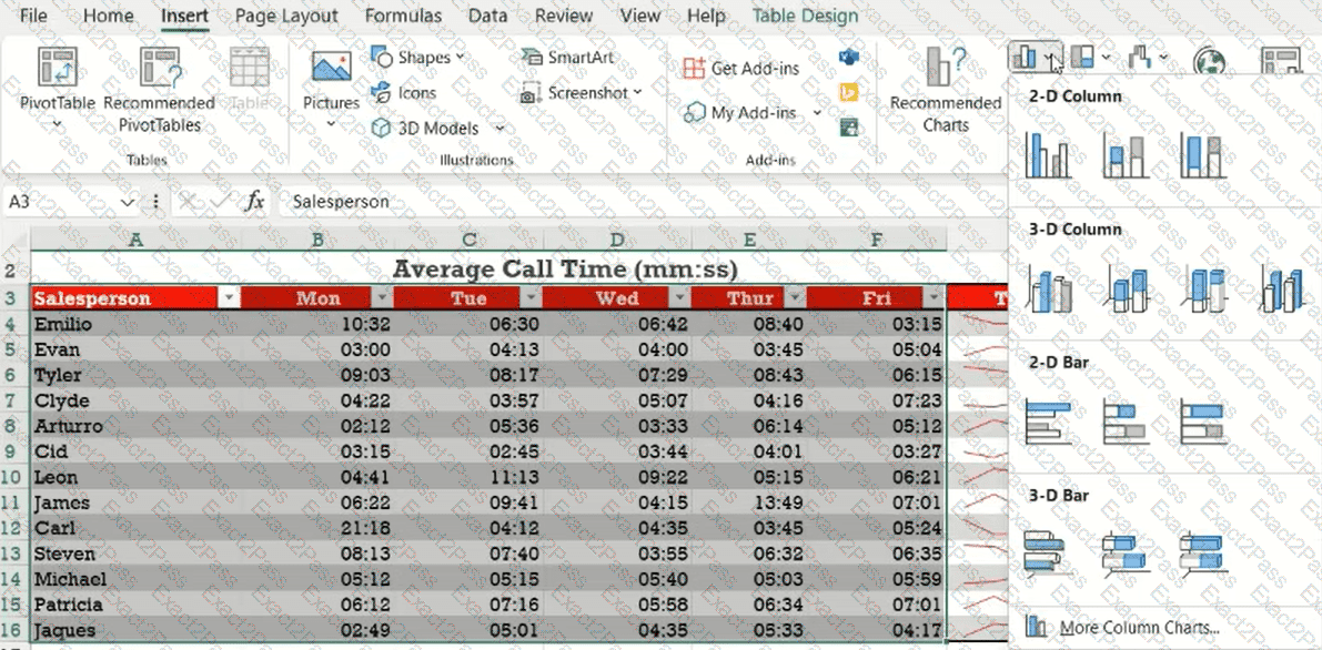 On the Average Call Time worksheet, create a 3-D Clustered Column chart that shows the call times for each Salesperson from Mon through Fri. Insertthe Chart Title Average Call Time. Position the new chart below the table.