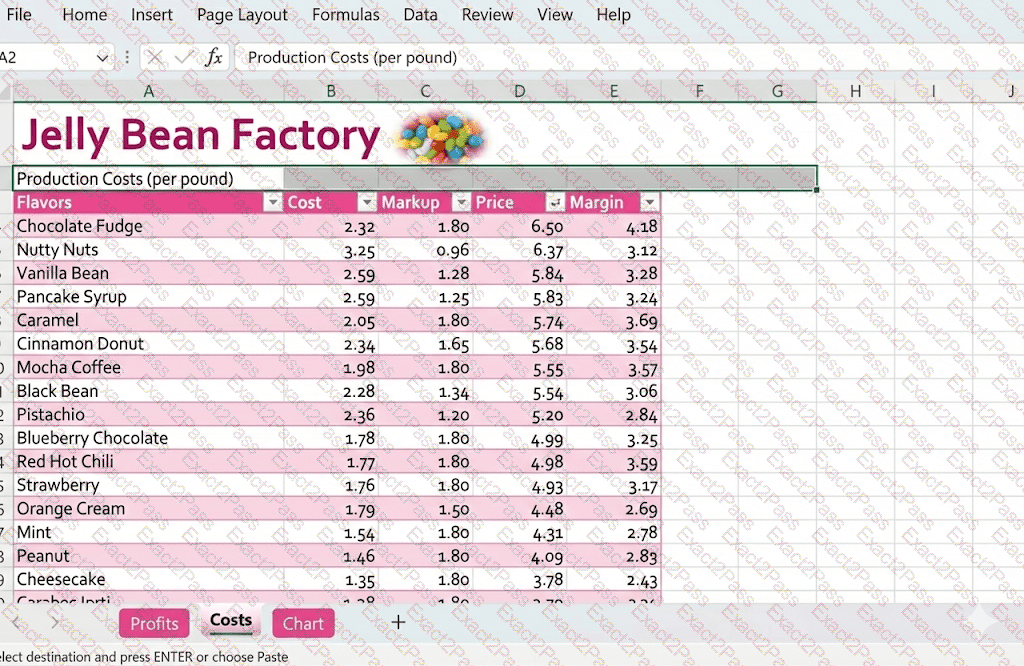 Use a builtin Excel feature to copy all of the formatting of cell range A2:G2 located on the Profits worksheet and apply that formatting to cell A2 on theCosts worksheet.