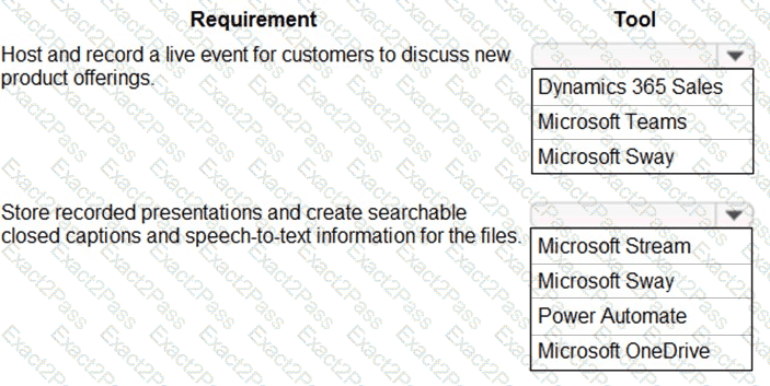 You need to select the Microsoft tool that the sales team should use for each requirement.