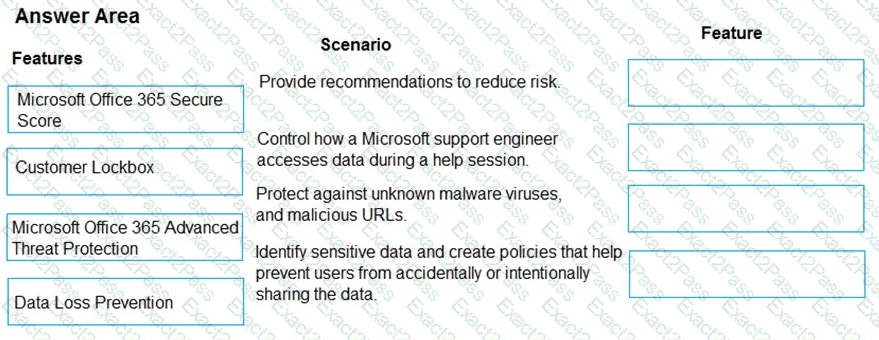 Which features should you implement? To answer, drag the appropriate features to the correct scenarios. Each feature may be used once, more than once, or not at all. You may need to drag the split bar between panes or scrollto view content.
