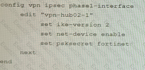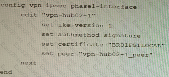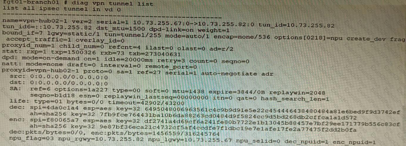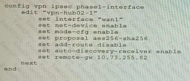 A Hub FortiGate is connecting multiple branch FortiGate devices separating the traffic centrally in unique VRFs. Routing information is exchanged using BGP between the Hub and the Branch FortiGate devices.