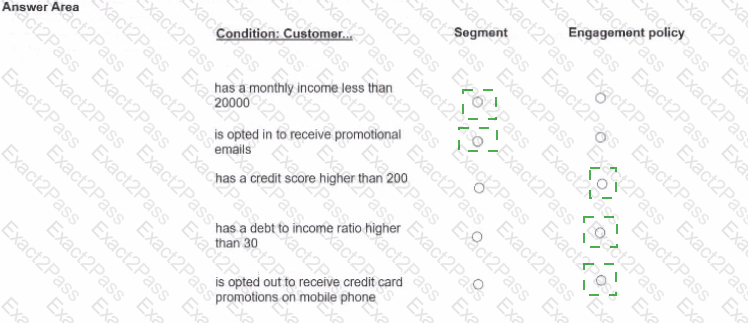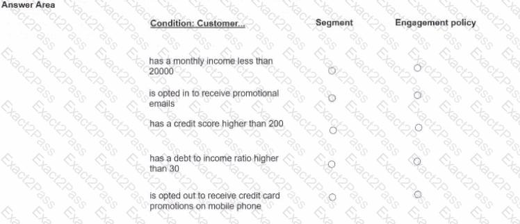 For each condition below, select which two conditions should be defined in Segment and which three conditions should be defined in Engagement policy as best practice