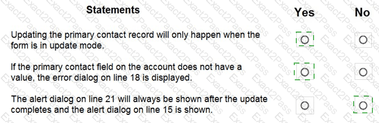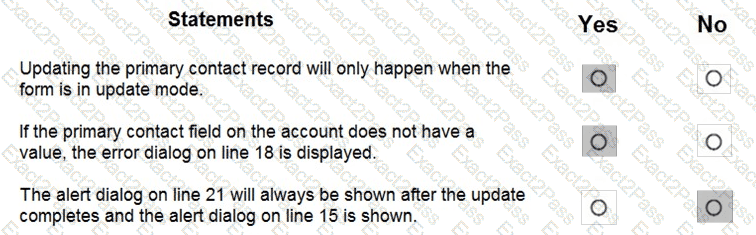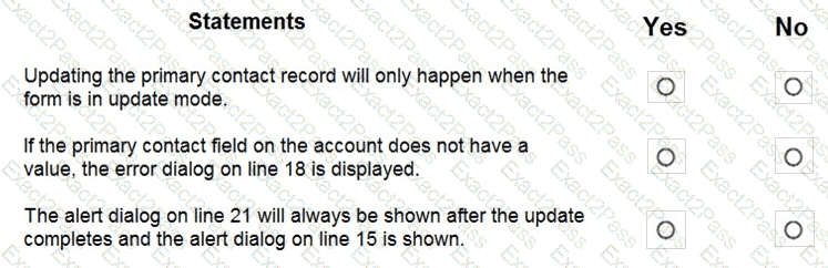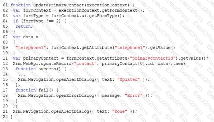 This code is properly registered to the OnChange event of the telephone1 field on an account entity form. The main operation is to update the primary contact’s phone number when the account phone number changes. The primary contact field is a lookup. (Line numbers are included for reference only.)