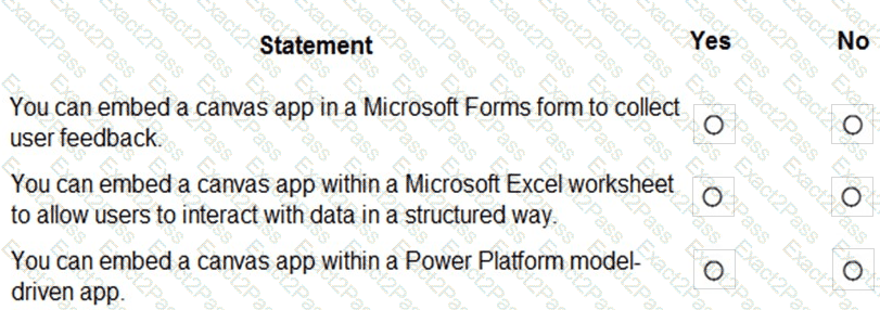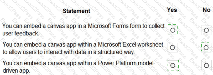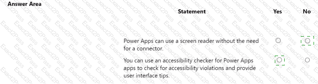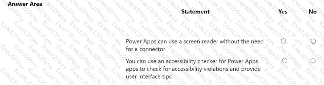 You are creating a Power Apps app. You want to ensure that the app can be used by individuals who have a vision impairment. For each of the following statements, select Yes if the statement is true. Otherwise, select No. NOTE: Each correct selection is worth one point.