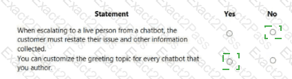 You are authoring a Power Virtual Agents chatbot for a company for each of the following statements, select Yes if the statement is true. Otherwise, select No.